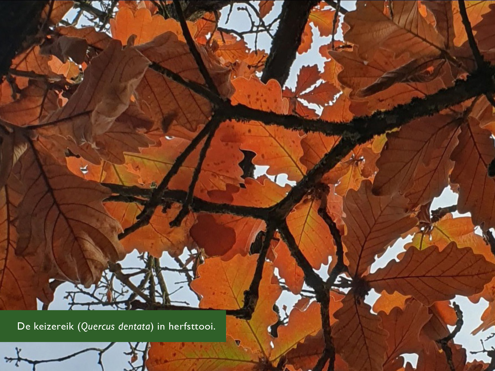 De keizereik (Quercus dentata) kleurt momenteel van oranje naar bruin. Kenmerkend voor de keizereik is zijn verdroogde, bruine, dode blad dat lang – vaak tot midden in de winter – aan de boom blijft zitten.