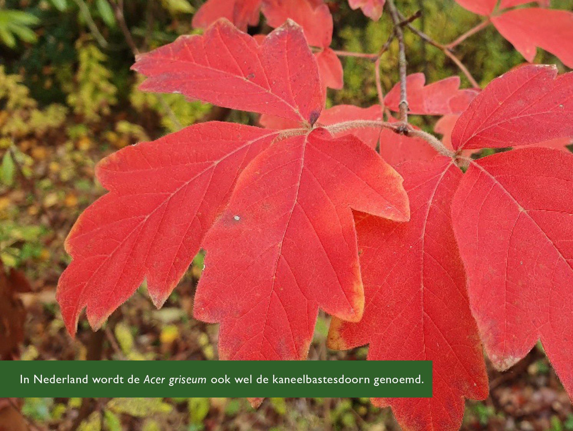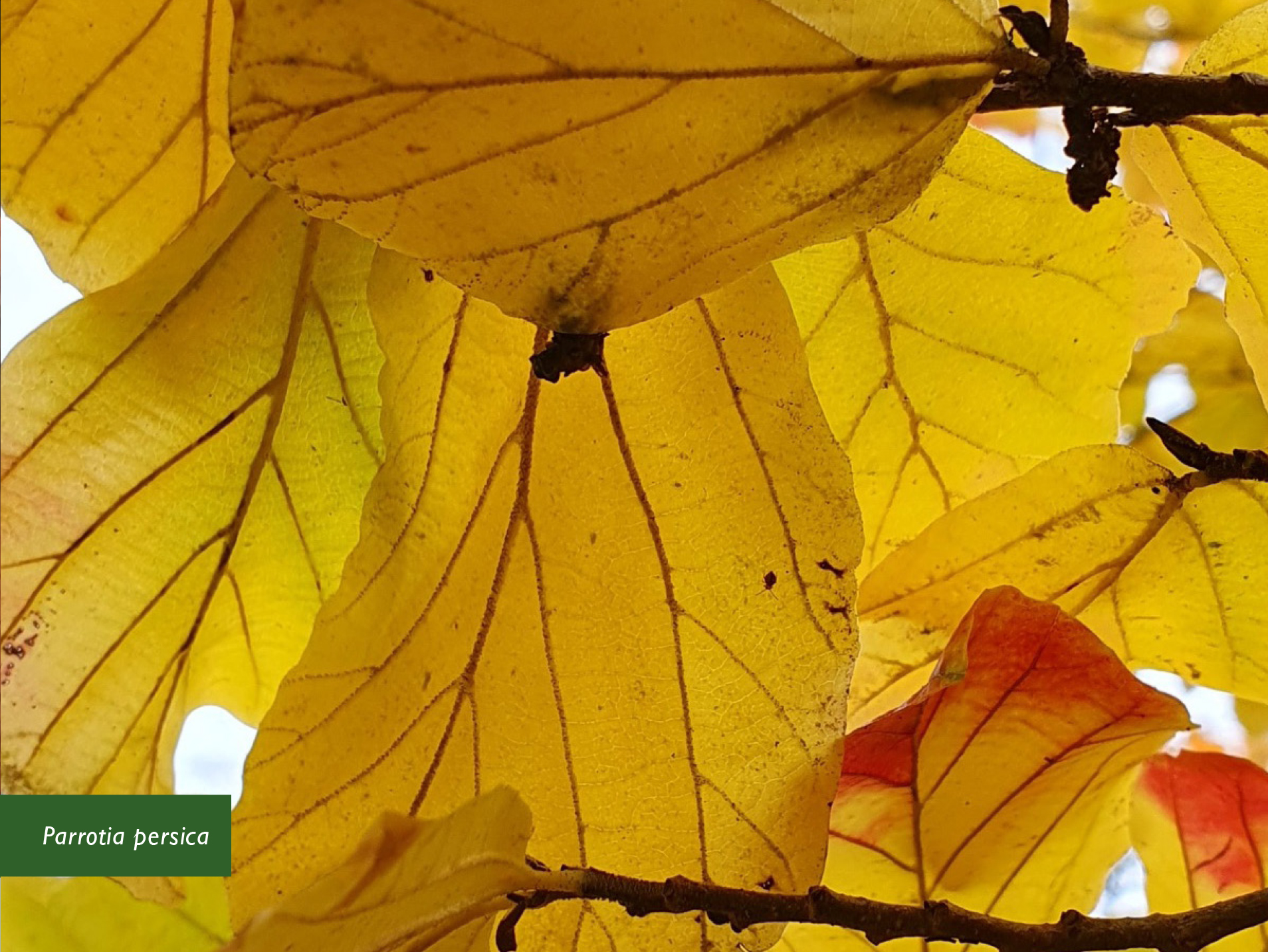 De blad van het Perzisch ijzerhout (Parrotia persica) is schitterend geel tot rood, waarbij de donkerkleurige nervenstructuur goed opvalt. En ook de Chinese Acer griseum heeft, naast zijn typische oranjerode bast, een fantastische rode herfstkleur.