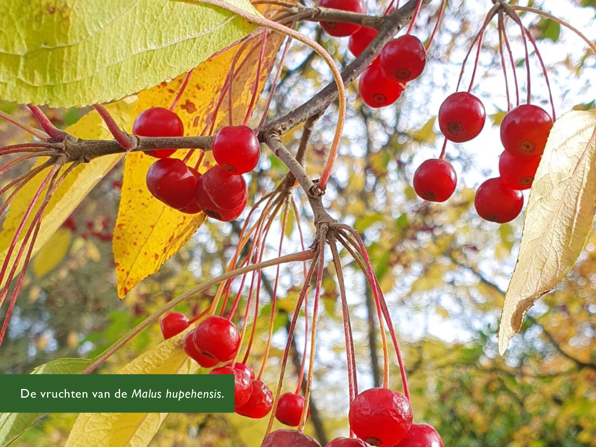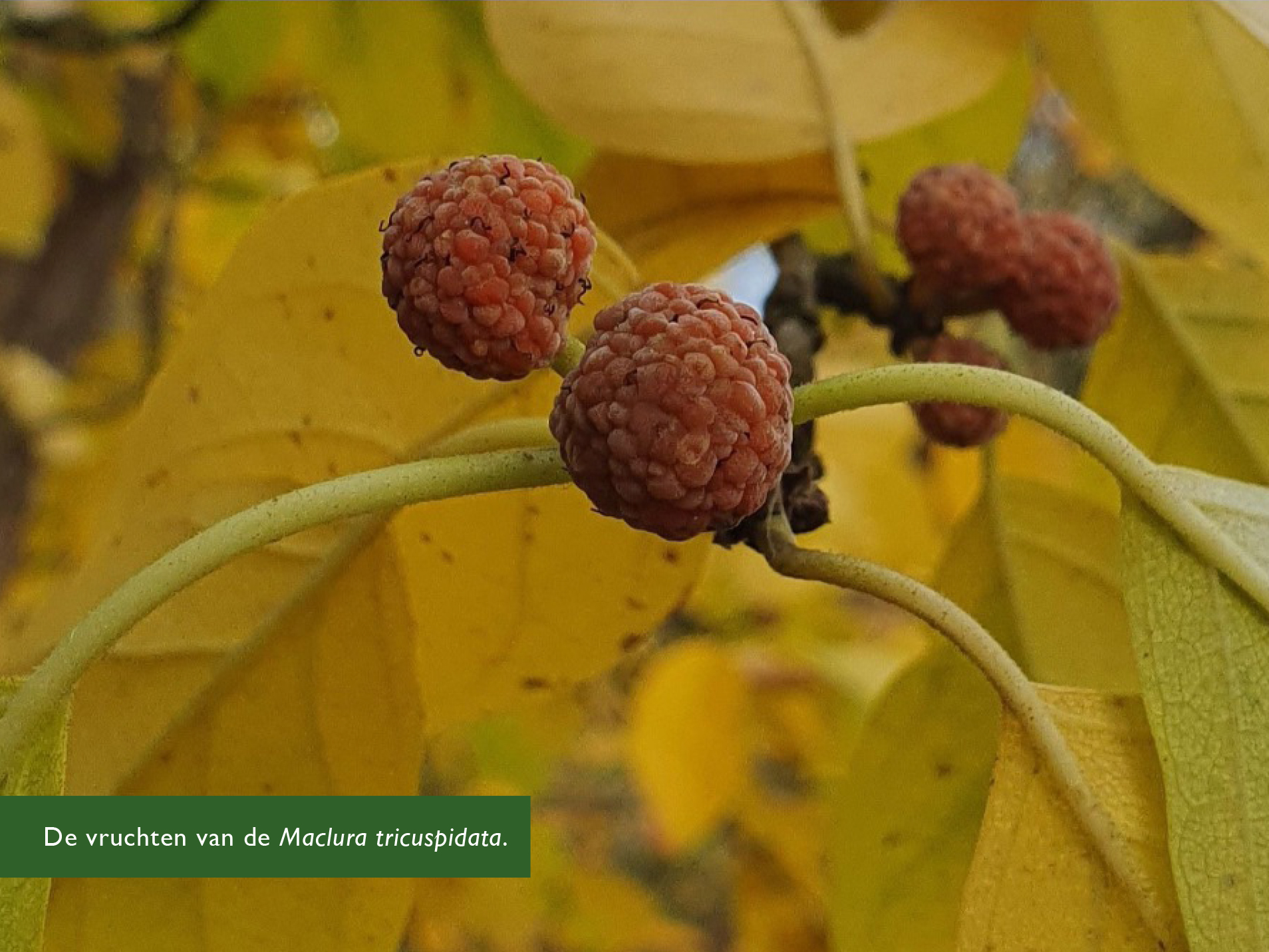 De Malus hupehensis, een sierappel uit China, heeft niet alleen een mooie gele herfstkleur. De boom hangt momenteel helemaal vol met kleine rode vruchten aan lange stelen die zo op het eerste gezicht veel weg veel weg hebben van grote bessen. Maar het zijn gewoon hele kleine appeltjes, niet voor menselijke consumptie geschikt. De heel bijzondere Maclura tricuspidata, ook afkomstig uit het oosten van Azië, laat met zijn vruchten zien dat hij verwant is aan de moerbei.
