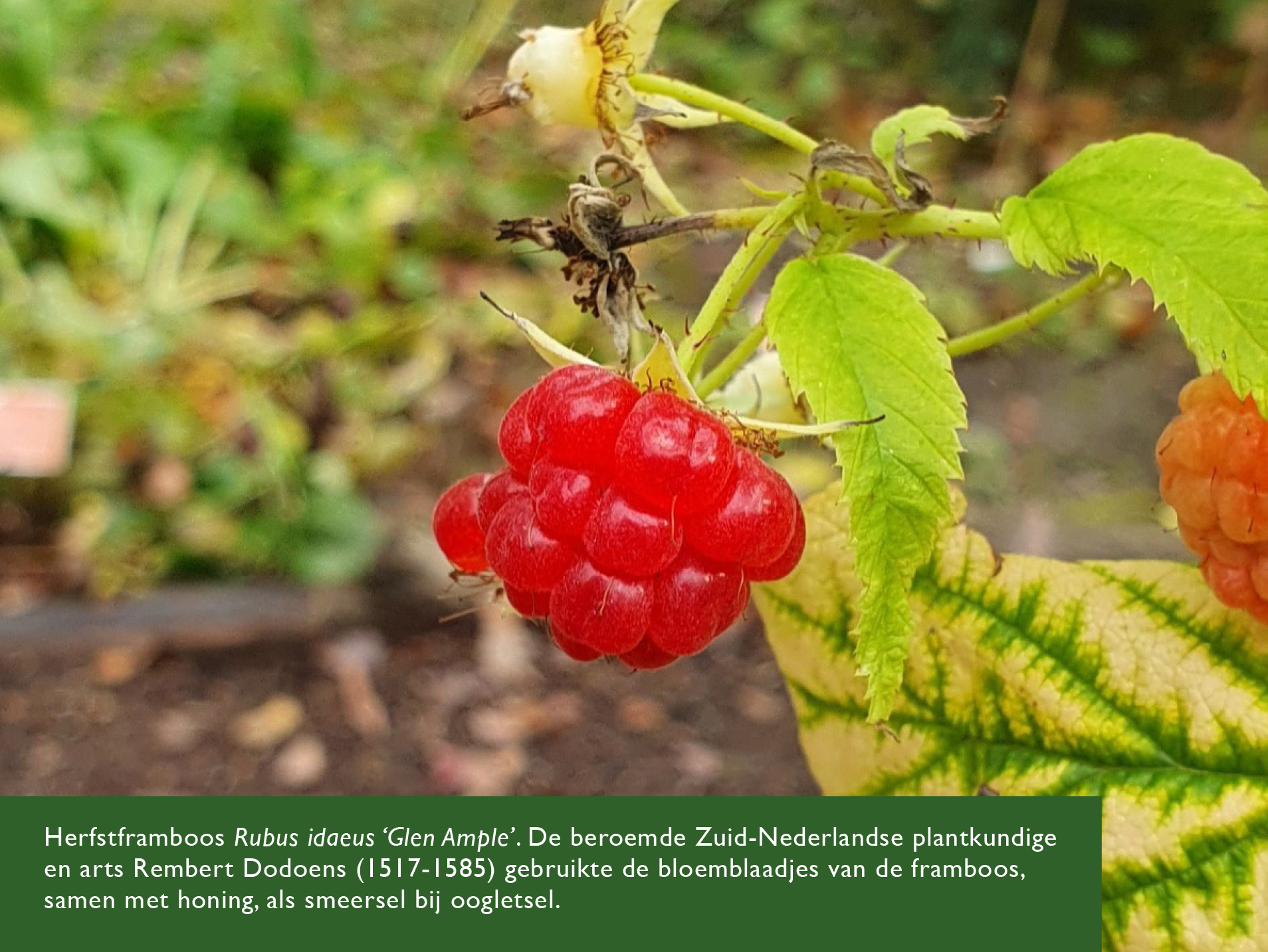 Een van de laatste frambozen hangt eenzaam aan zijn stengeltje en de hopbellen van de hop (Humulus lupulus) zijn nu prachtig te zien. Deze hopbellen zijn onmisbaar bij de productie van bier. Bovendien staan de hopbellen al eeuwenlang bekend om hun ontspannende, rustgevende werking. In de tuinen van de oude Romeinen werden jonge hopscheuten wel geteeld als groente.